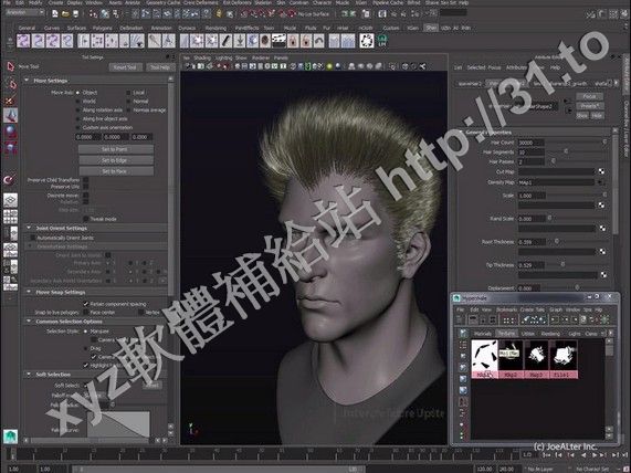 Joe Alter Shave and a Haircut is a plugin for Maya, that creates extra realistic hair and fur surfaces. With this, you can create furry animals, grasses, haircuts, mustaches and so on. And this is not only about extra rendering-realistic, but also extra dynamic-realistic hair/fur. Combining advantages from both Maya Fur and Maya Hair modules inside itself, JA S&H is a perfect decision for your production. It makes creating of haircuts much easier with much finer level of control and much less rendering time. S&H also MentalRay- and RenderMan-compatible, so you can create super-photorealistic renderings using with no additional compositing.
